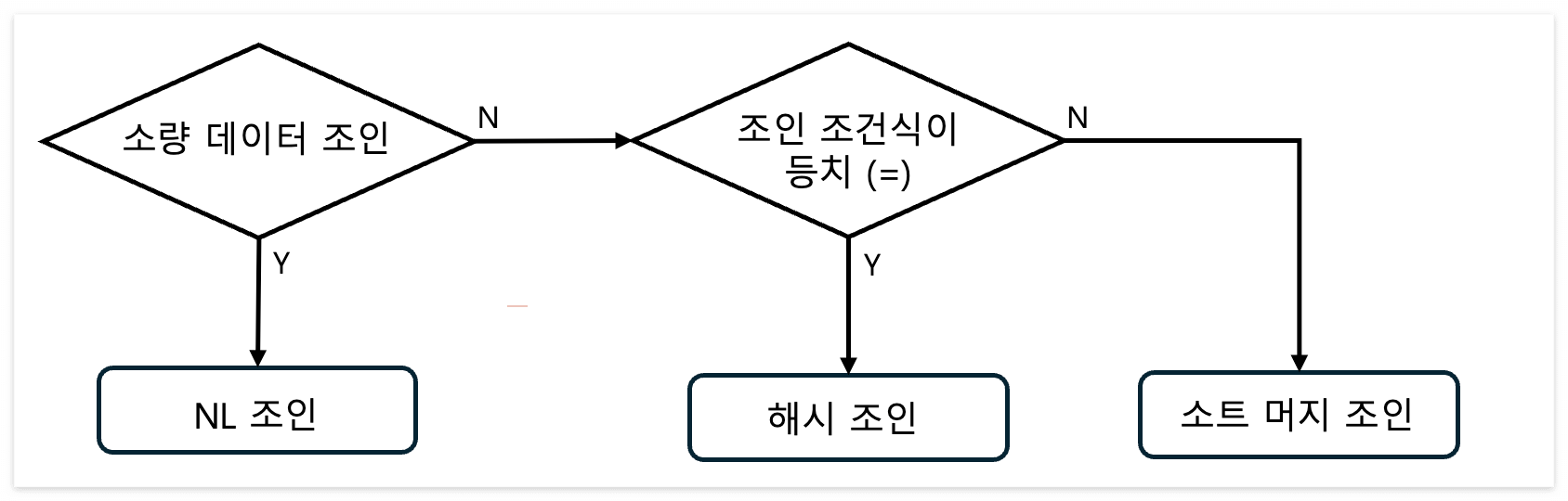- 조인 컬럼에 인덱스가 없거나, 대량 데이터 조인이어서 인덱스가 효과적이지 않을 때, 옵티마이저는 NL 조인 대신 소트 머지 조인이나 해시 조인을 선택한다.